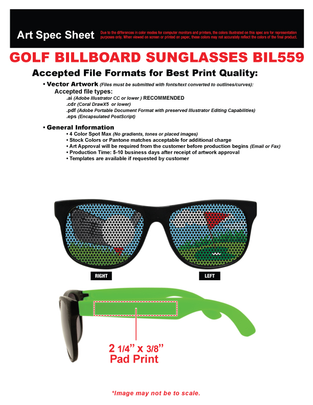 Price includes a full color imprint on both lenses. Imprints on either arm (temple) of the Sunglass is available at additional charge.