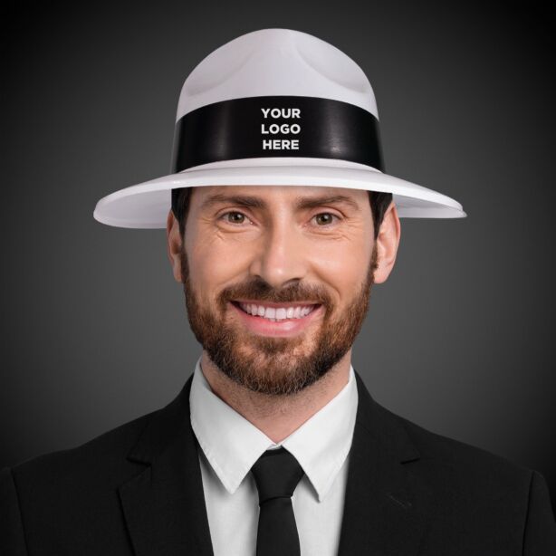 Show off your inner gangster or dress up for a 1920s themed party with our White Plastic Fedora with Black Band. Imprint your logo on the band for the perfect promotional giveaway or party favor. One size fits most. Priced by the piece but packed in a poly bag of 12 pieces. UNIMPRINTED HATS have a 12 piece minimum.
