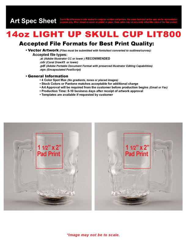 Above pricing includes a 1 color imprint in 1 location. For all imprinting add a Set-up fee of $55 (v). We may offer additional locations and up to 4 spot colors, PMS matches acceptable @ $14 (v) per color. For each additional location and for each additional spot color add a Set-up fee of $55 (v) and a running charge of $.25 (v) per color, per location. Repeat set up fees apply. Call for details. Imprint Minimum is 96 pcs. Imprint Method: Pad Print Only. Production Time: 10 business days after receipt of artwork and approval.