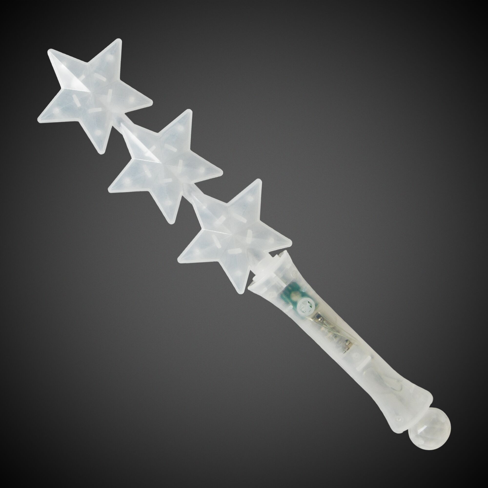 Dazzle your new clients when you welcome them aboard with the Triple Star LED Glow Light Up Wand! The 12 3/4" scepter shows the world that your company is a super star. The eye-catching triple star wand is colorful and fabulous, featuring six flashing light up modes for a brilliant light show. Each wand comes 3 replaceable AG13 batteries (included and installed) to power 6 different flashing light modes for a dazzling light show. Customize it with your company name or logo using the pad printing imprint option or leave it unimprinted. Show your customers why your company is the star!
