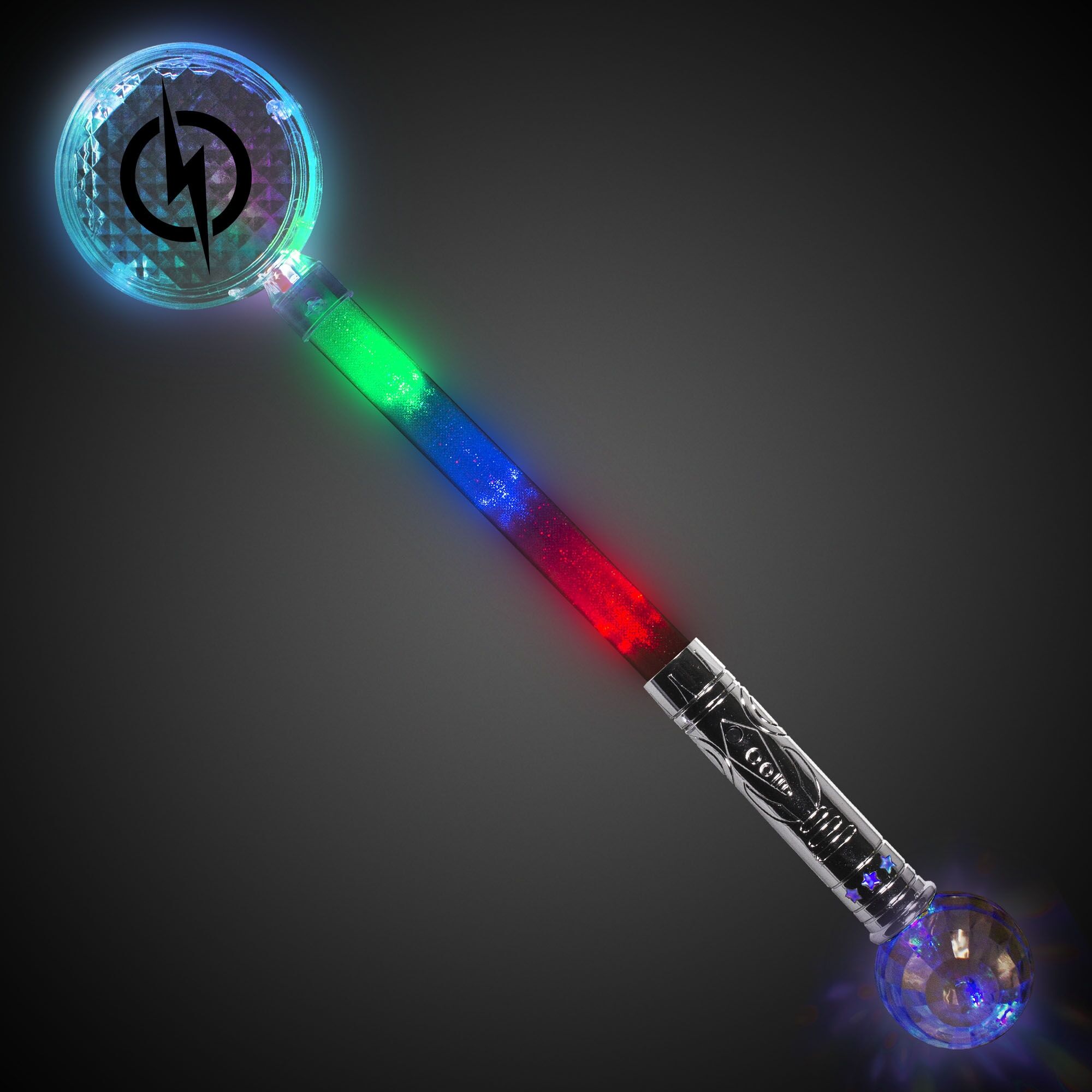 Our 20" Jumbo Light Up Circle Wand with Prism Ball will light up your logo or brand with a wash of multicolor lights. Each LED wand has a clear plastic circle on top and prism ball with a silver handle reflecting bright LED lights in green, blue, and red. Change from fast flash, slow flash, and multi-function modes with a simple push of a button. Each jumbo 20" Jumbo Light Up Circle Wand with Prism Ball comes with 3 replaceable AAA batteries already installed.