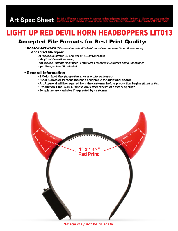 Above pricing includes a 1 color imprint in 1 location (same imprint on both horns). For all imprinting add a Set-up fee of $55 (v). We may offer additional locations and up to 4 spot colors, PMS matches acceptable @ $14 (v) per color. For each additional location and for each additional spot color add a Set-up fee of $55 (v) and a running charge of $.25 (v) per color, per location. Repeat set up fees apply. Call for details. Imprint Minimum is 144 pcs. Imprint Method: Pad Print Only. Production Time: 10 business days after receipt of artwork and approval.