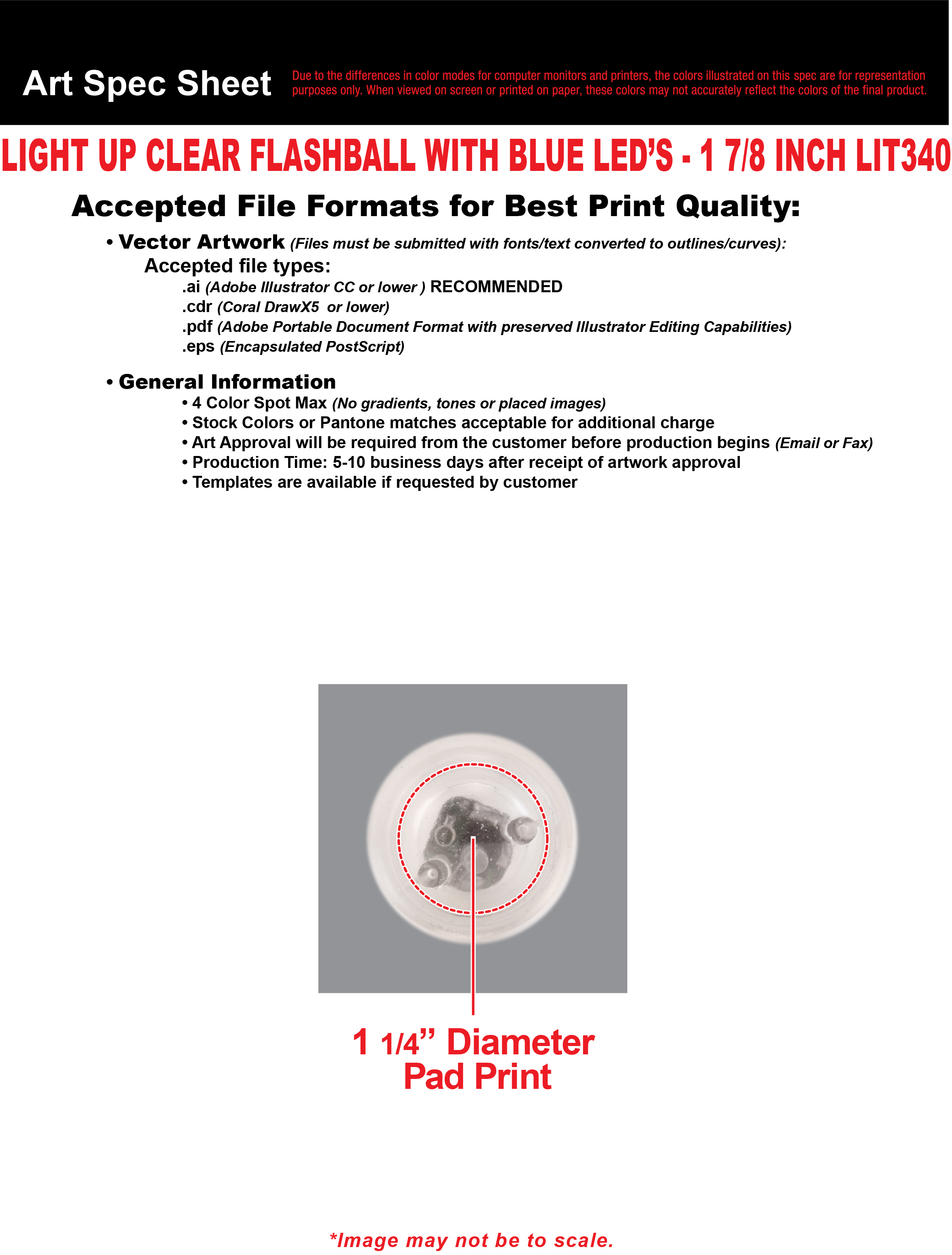 Above pricing includes a 1 color imprint in 1 location. For all imprinting add a Set-up fee of $55 (v). We may offer additional locations and up to 4 spot colors, PMS matches acceptable @ $14 (v) per color. For each additional location and for each additional spot color add a Set-up fee of $55 (v) and a running charge of $.25 (v) per color, per location. Imprint Minimum is 192 pcs. Imprint Method: Pad Print Only. Production Time: 10 business days after receipt of artwork and approval.