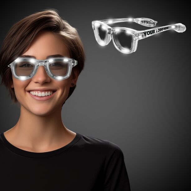 Keep the party going and look cool when you wear our WhiteLED sunglasses. These battery operated light up sunglasses are made out of clear plastic and feature tinted lenses and LEDs throughout. With a click of the on/off button you can choose from 3 different light settings; slow flash, fast flash and steady on.With a click of the on/off button you can choose from 4 different light settings; slow flash, fast flash and steady on or flick the switch again and choose the sound reactive light up function. One size fits most. 3 – AG13 batteries includes and installed.