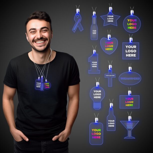 Blue LED Necklaces with attached pendants in all sizes and shapes. Please see below for shapes and printing options. Blue, Oval, Square, Star, Round, Heart, Rectangle, Martini, Bottle, Cross, Dog Tag, Lightbulb, Light Bulb, Ribbon, #1, Beerfest, Oktoberfest, Holidays, Christmas, Hanukkah, NYE, New Years, Patriotic, Valentine's Day, Drinks, Bars, Restaurants, School, Back to School, Spirit, Easter, Drinking, Awareness, Pride, Sports